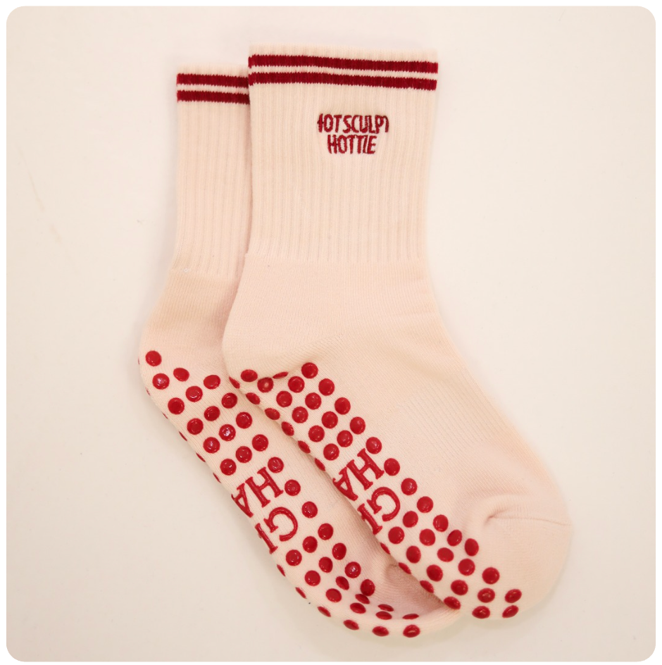 These beige ribbed grip socks bring hot-studio energy with crimson details, a flame icon, and a grip sole that keeps you locked in while everything else is shaking.